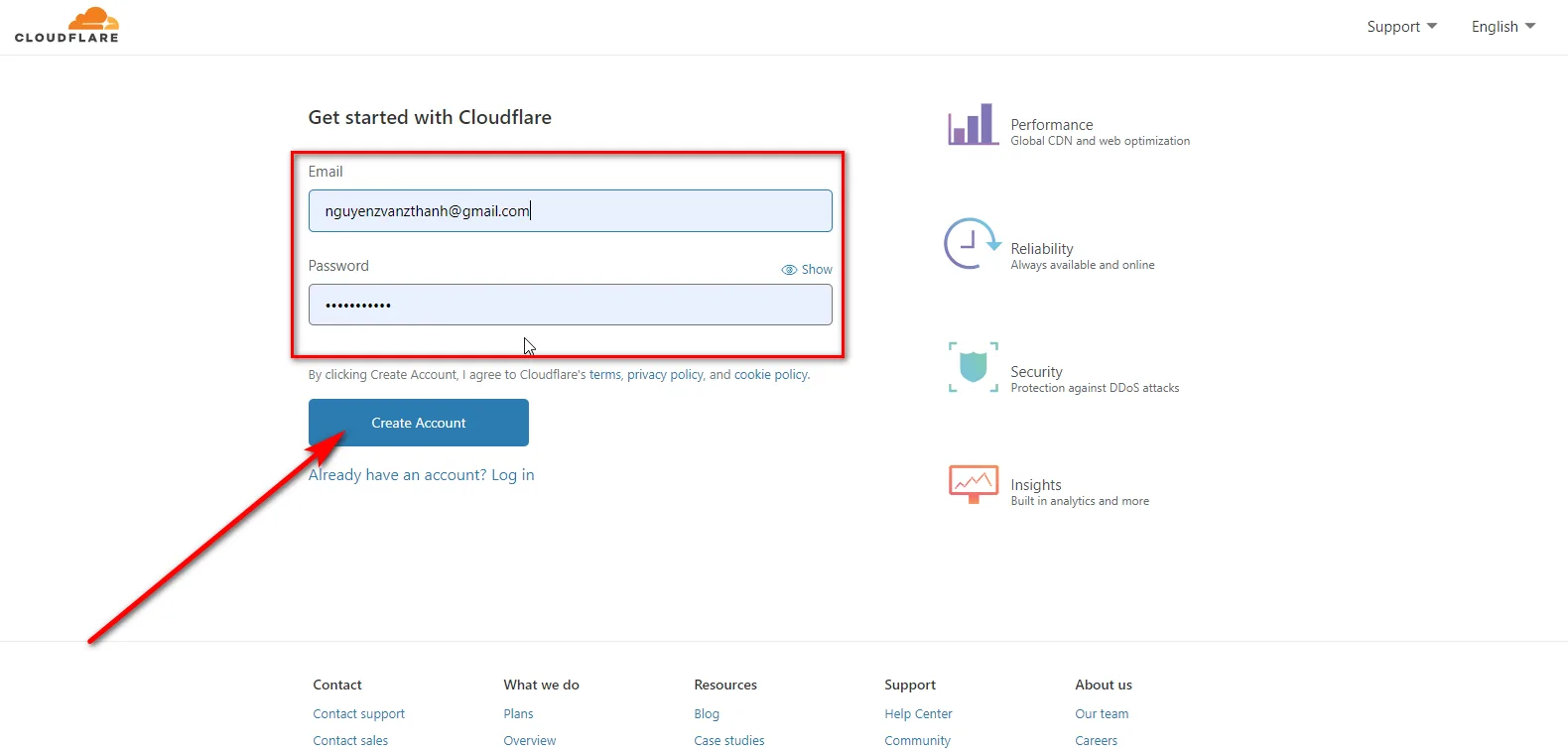 Bước 1: Bạn truy cập vào đây: www.cloudflare.com Đây là đường dẫn sẽ dẫn đến trang chủ của cloudflare, chúng ta sẽ đăng ký tài khoản cloudflare tại đấy