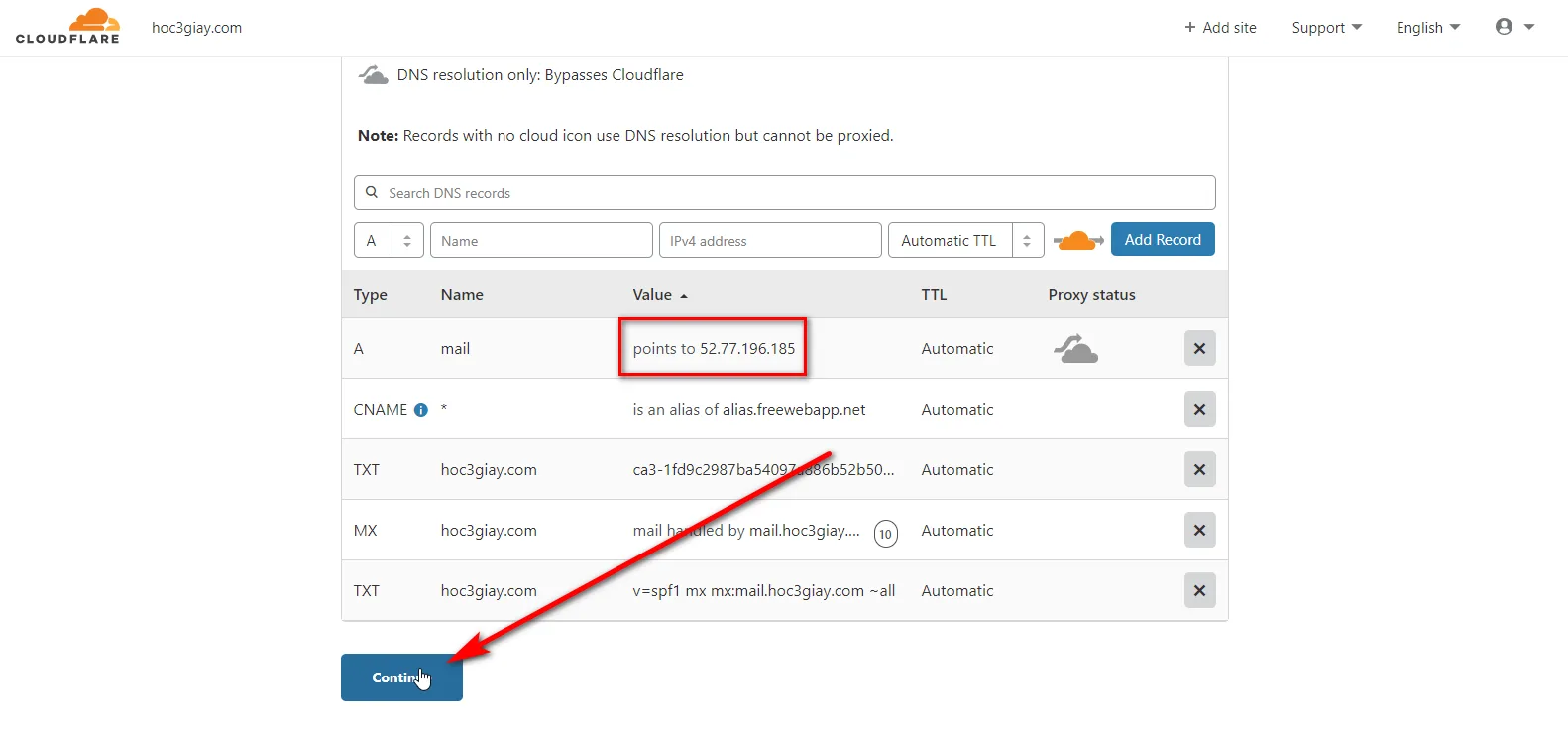 Bước 7: Ở trang tiếp theo này, Cloudflare muốn chúng ta trỏ tên miền của chúng ta về nameservers của cloundflare. Để làm được việc này thì bạn cần tới nơi mà bạn đã đăng ký tên miền sau đó bạn vào trang quản lý tên miền của bạn. Bạn tiếp tục vào phần DNS, khi đó bạn tìm tới mục Máy chủ tên miền rồi thay đổi nó bằng các Nameservers của cloundflare ở phần như hình dưới đây.