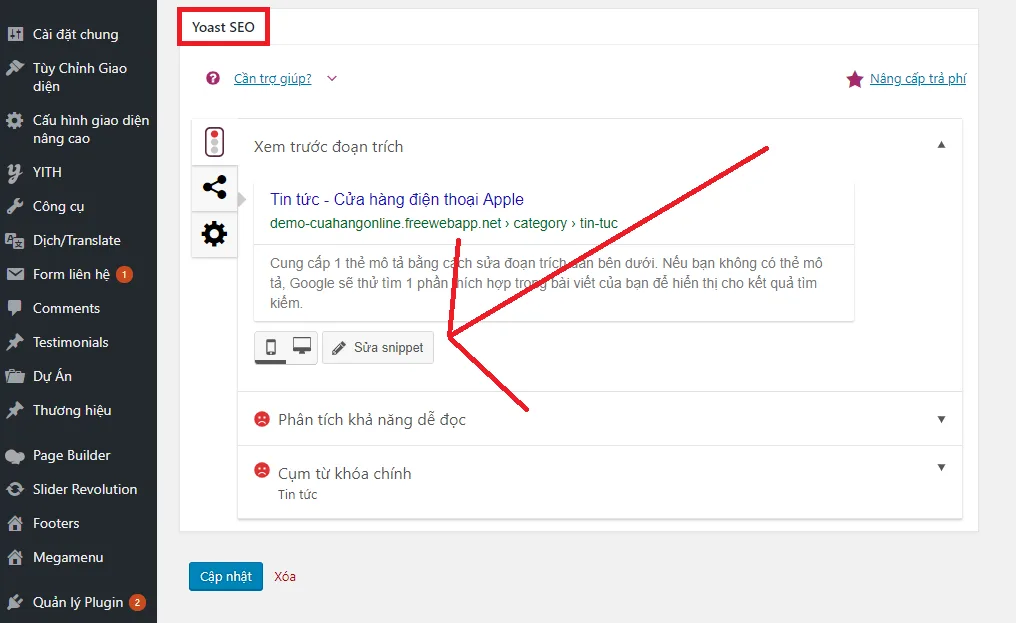Bước 3: Tại hôp thoại chỉnh sửa chuyên mục bạn lăng con chuột xuống phía cuối cùng của trang, bạn sẽ thấy có phần Yoast SEO. Bạn nhấp chuột vào nút sửa snippet trên phần Yoast SEO như hình: