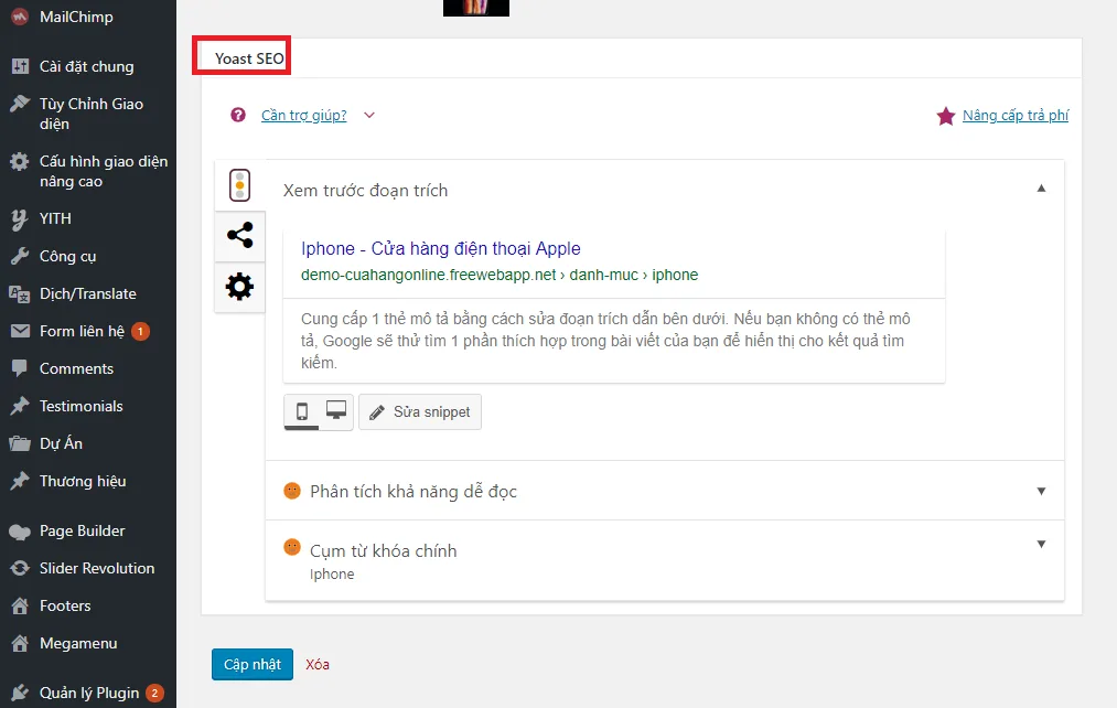 Bước 3: Trong hộp thoại chỉnh sửa danh mục bạn lăng con chuột xuống phía dưới cùng và bạn sẽ nhìn thay phần yoast SEO như ở bên hôp thoại của chỉnh sửa chuyên mục.