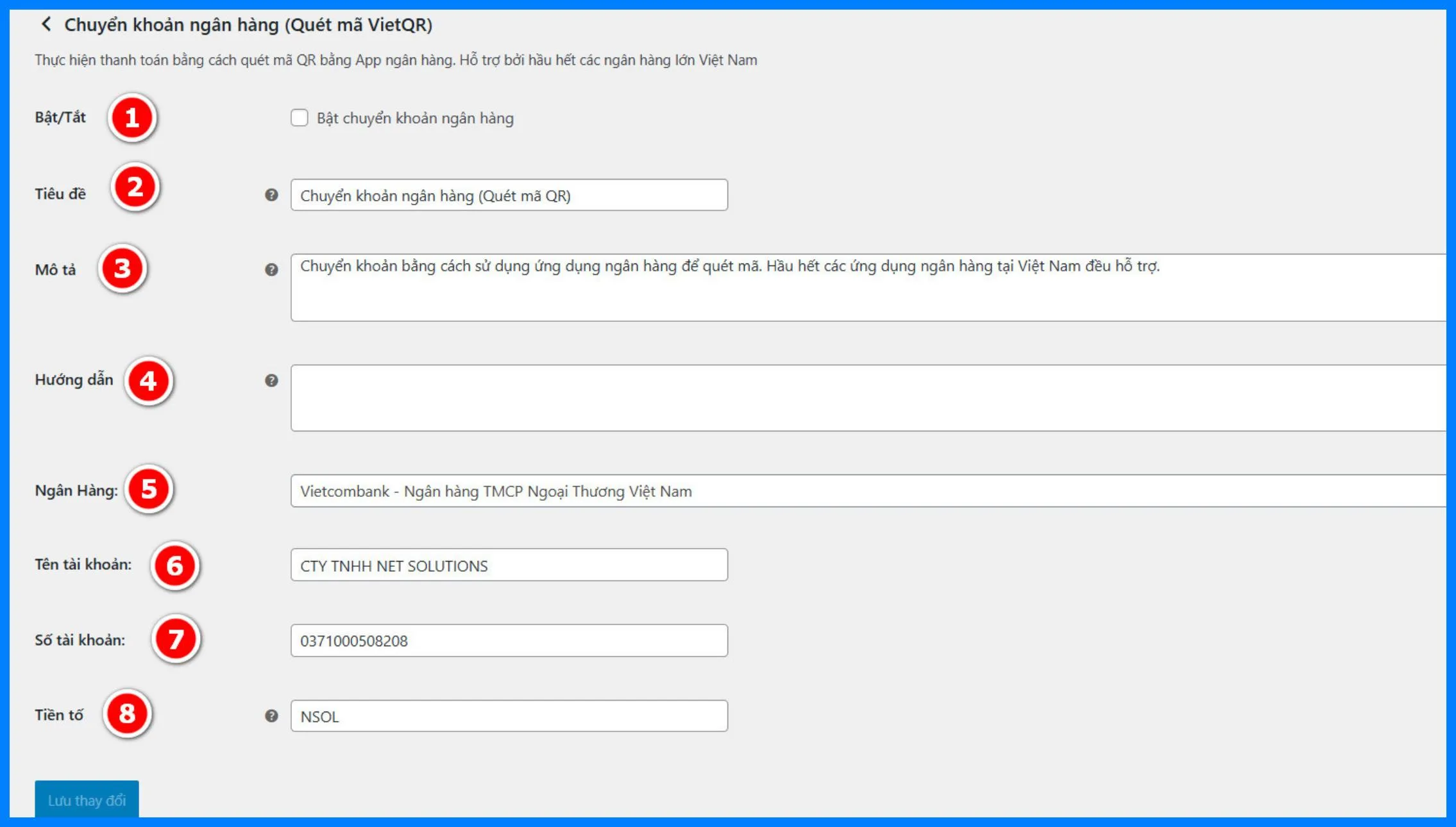 - Số 3: Mô tả nó hiện bên dưới sản phẩm bạn gõ là “Chuyển khoản bằng cách sử dụng ứng dụng ngân hàng để quét mã. Hầu hết các ứng dụng ngân hàng tại Việt Nam đều hỗ trợ” hoặc câu khác tùy bạn.