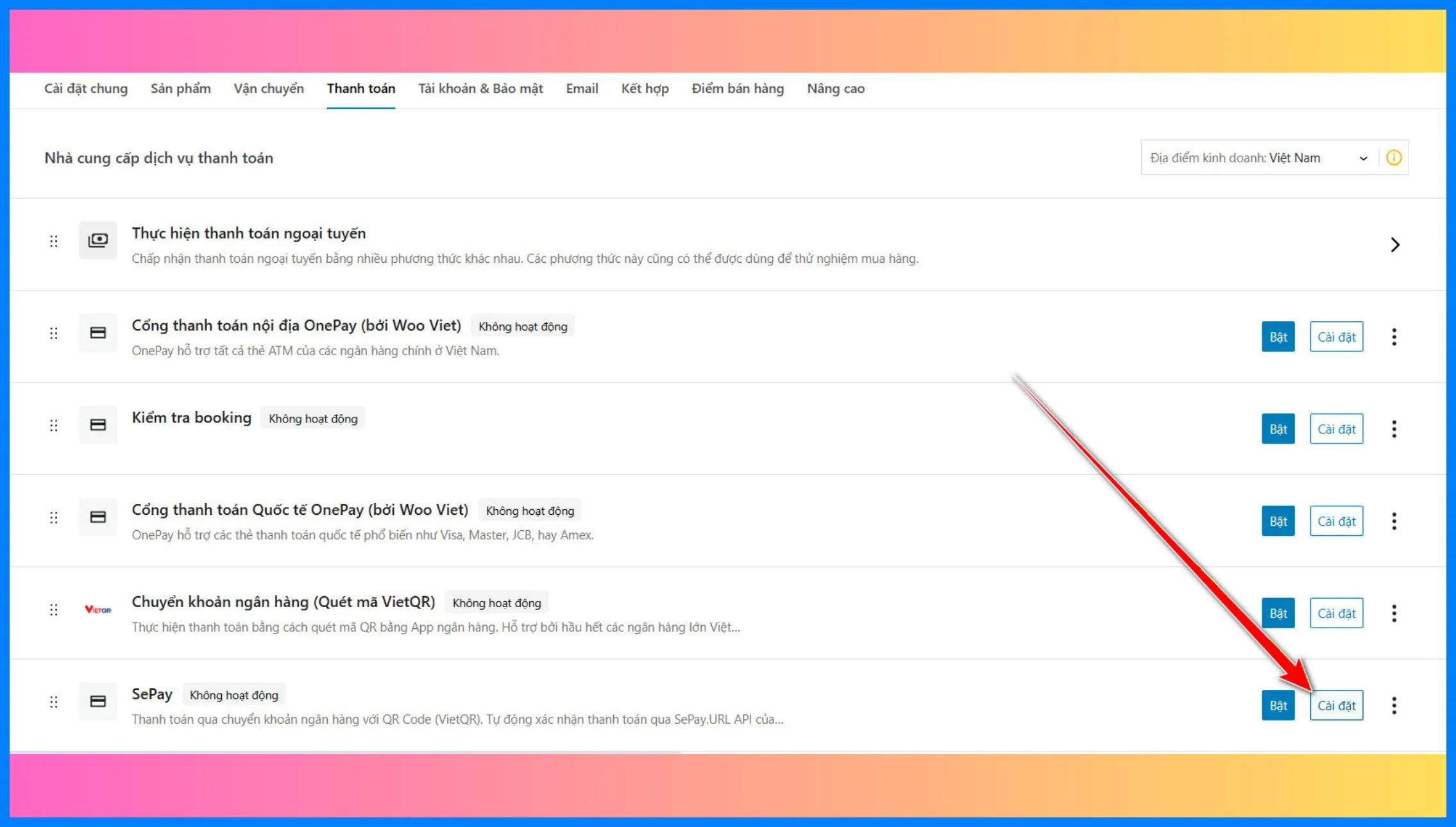 Lưu ý: Chỉ kích hoạt một trong hai phương thức thanh toán: VietQR hoặc SePay Gateway.