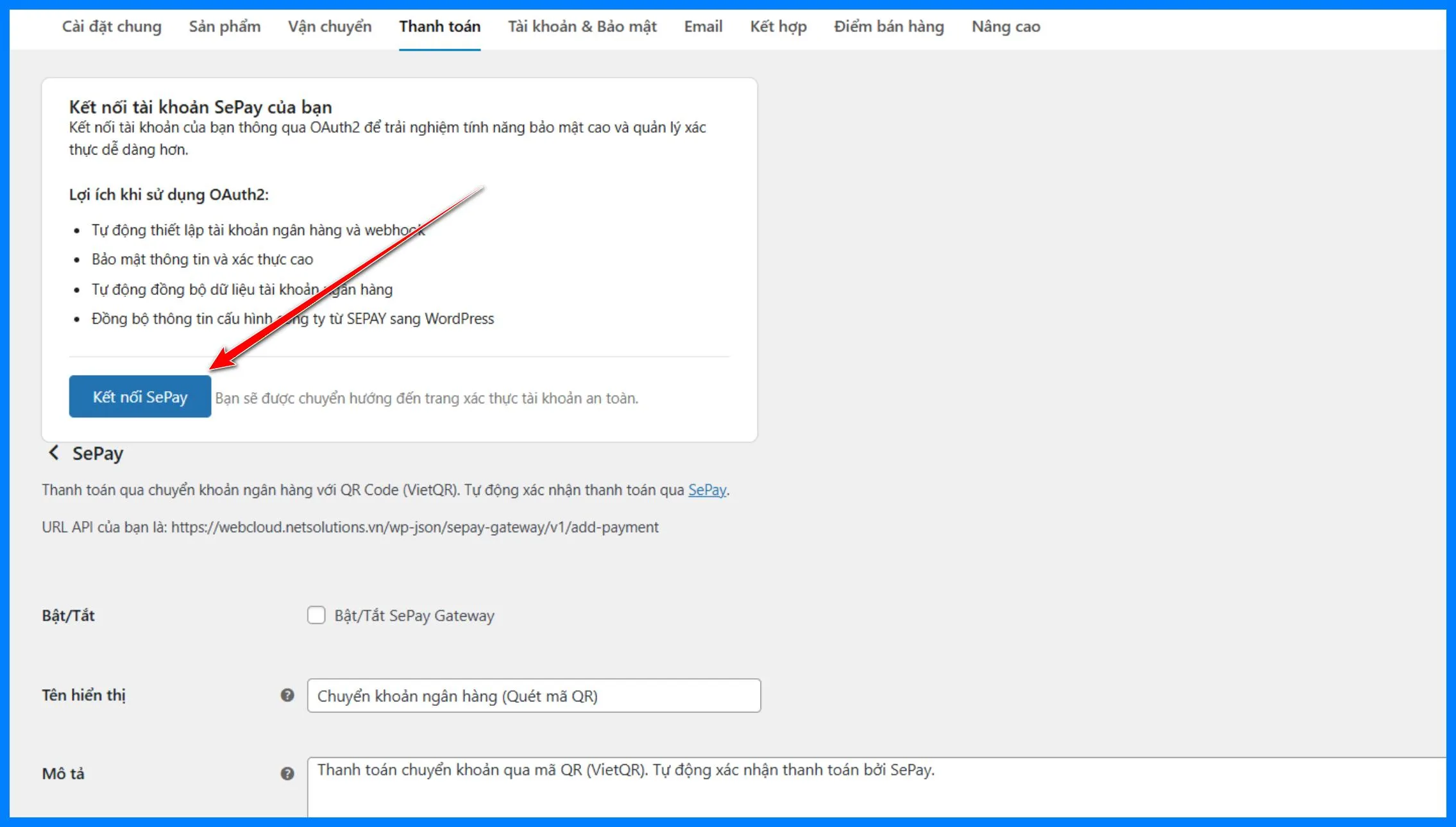 Bước 3: Nhấn nút kết nói đến tài khoản SePay và thiết lập các thông tin tương tự như VietQR ở trên.