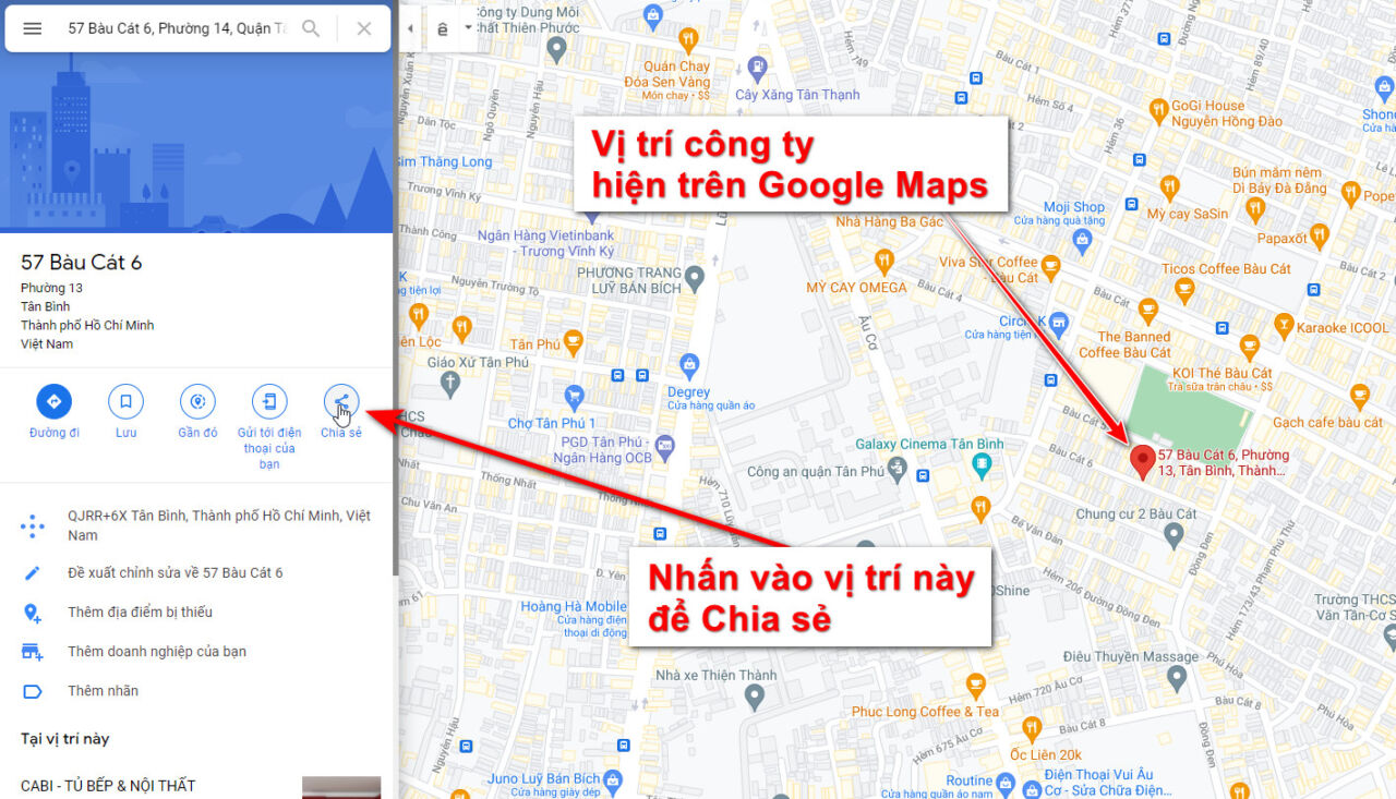 Bước 3: Google Maps sẽ bắt đầu tìm kiếm cái địa chỉ vừa nhập. Sau khi có kết quả bạn sẽ thấy được vị trí của công ty trên Google Maps. Tiếp theo đây thì bạn nhấn vào nút Chia sẻ như hình dưới đây.