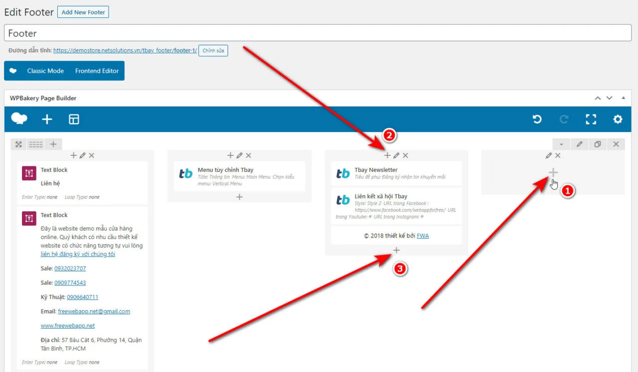 Xong rồi, mình đưa chuột vào cái mục Footer hiện đang dùng trên WEB để cho nó hiện lên chức năng Chỉnh sửa, mình nhấn vào đó.