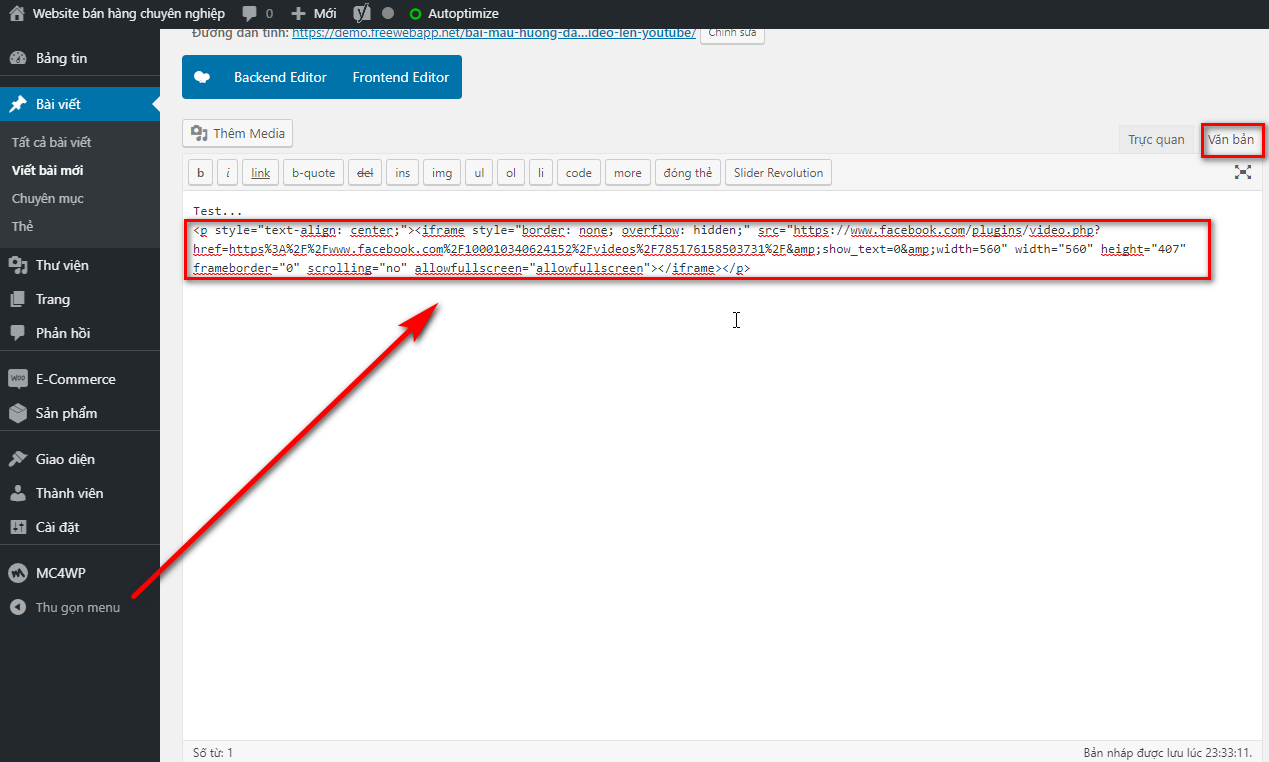 Bước 4: Chuyển qua phần viết Văn bản. Rồi dán đoạn code vừa copy vào trong phần nội dung viết bài.